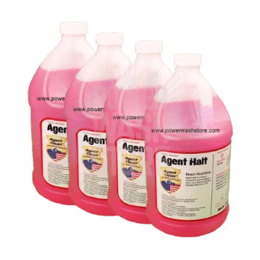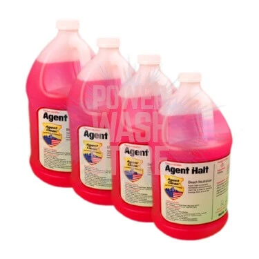 Pro tip: Agent Halt is effective at neutralizing bleach even after it has dried on. Use it after doing a building wash where the solution is sprayed over glass or windows. Rinse the windows with Agent Halt and water mix. Also can be used to rinse any cars affected by overspray, or to clean out any pumps and hoses after bleach use.