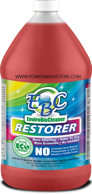 EBC Restorer formula works with excellent health and safety benefits. A low pH combination of selected chemical cleaners and a perfectly blended amount of soaps makes this a truly unique product for cleaning and restoring hard surfaces. Used for the removal of tire marks, restoring and revitalizing concrete, surface rust stains, mineral deposits. EBC Restorer replaces hydrochloric, citrus, glycolic, phosporic, nitric and other DOT hazardous acids – A low pH organic salt combined with a specific blend of cleaning agents that performs superbly in many cleaning and restoration projects.Â